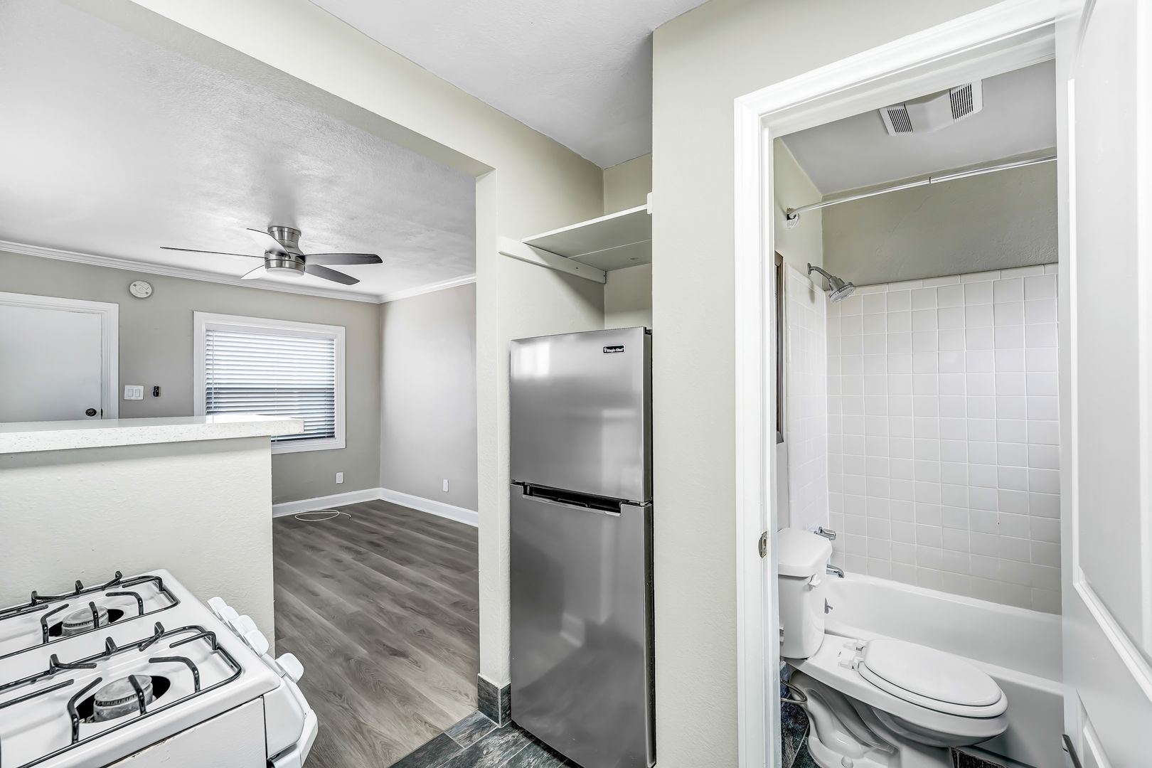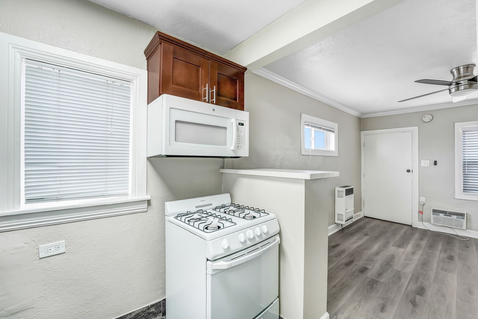 This 300 square foot bungalow style apartment features beautiful hardwood flooring throughout, granite countertops, appliances including a range/oven, refrigerator µowave. For your added comfort, this apartment also features air conditioning, heating, ceiling fan and energy efficient windows.