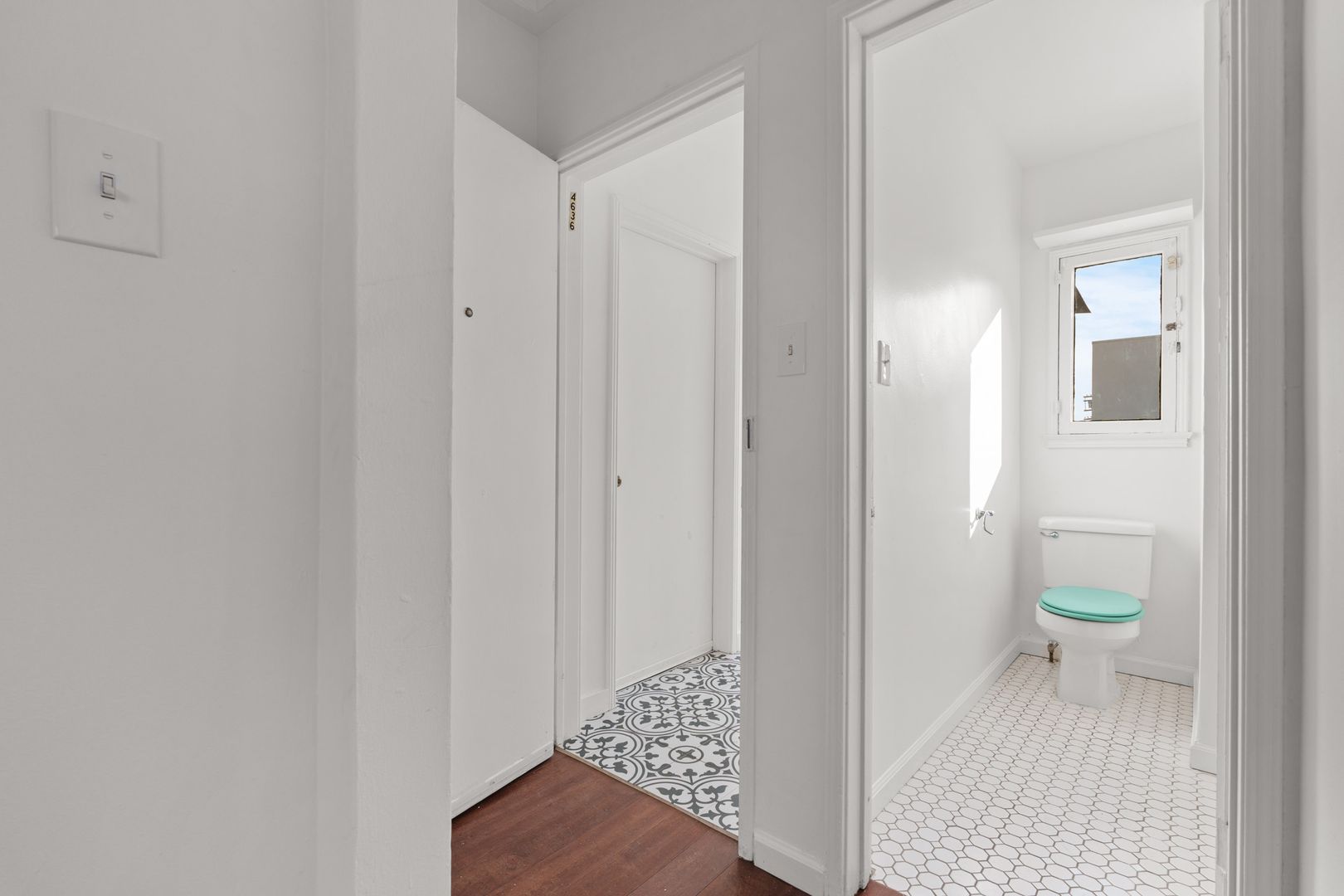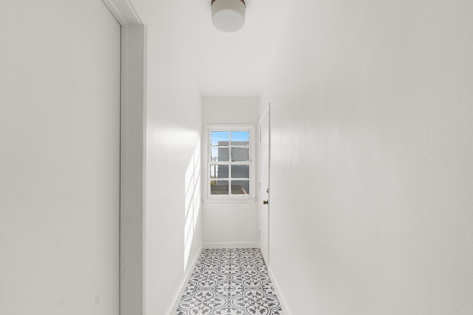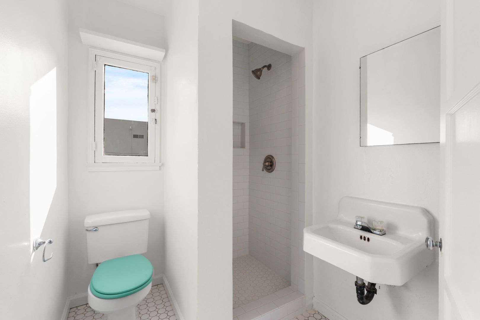 The newly renovated bathroom features a newly tiled shower and a wonderful retro tile design that matches the vintage Los Angeles charm of this property.