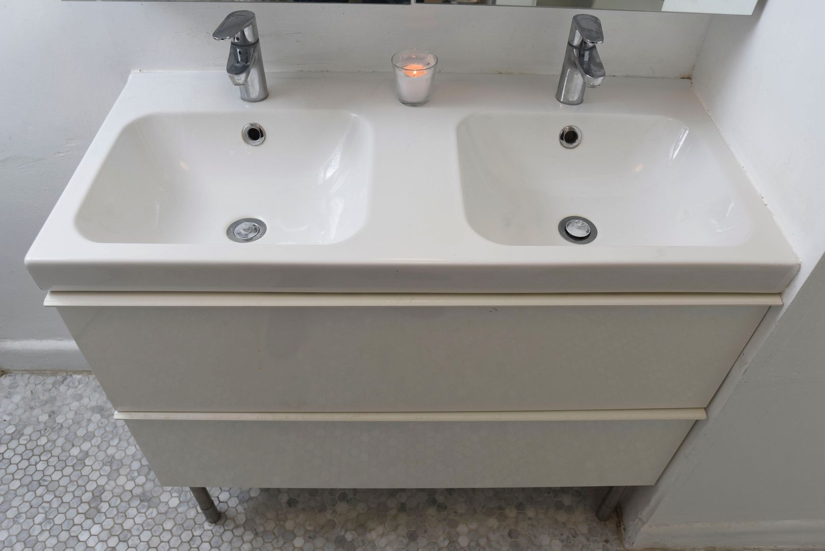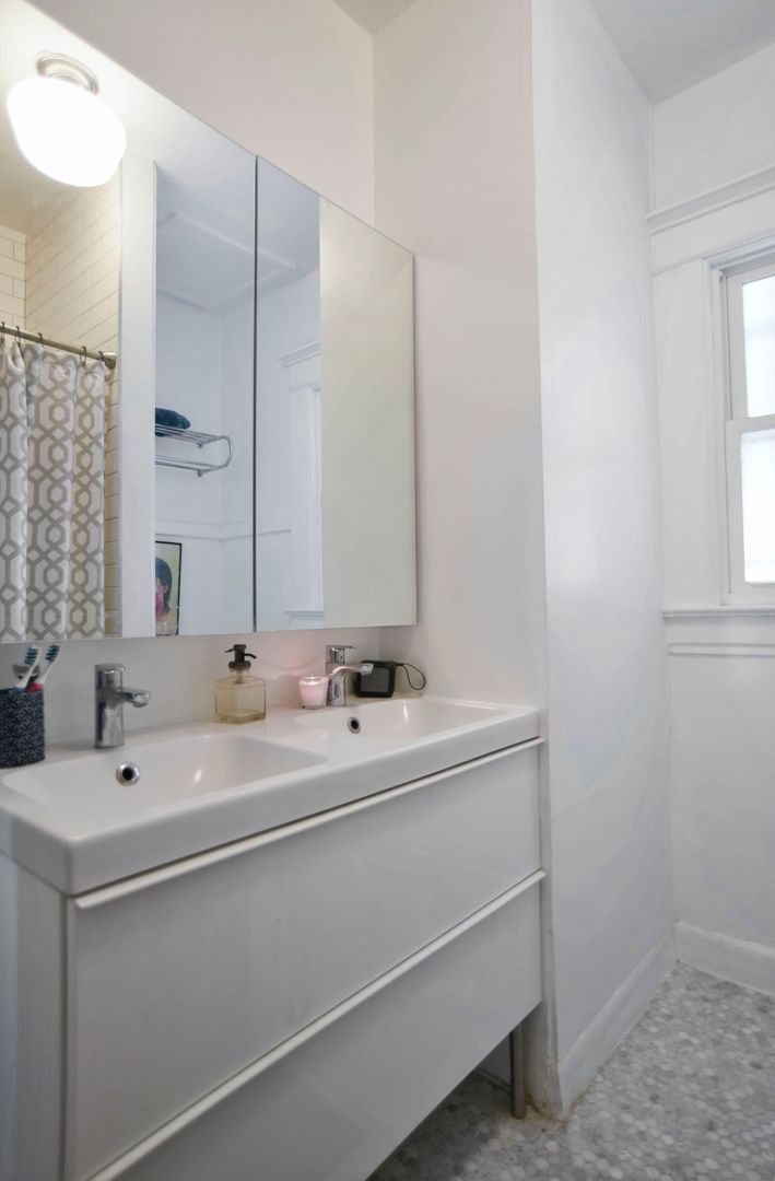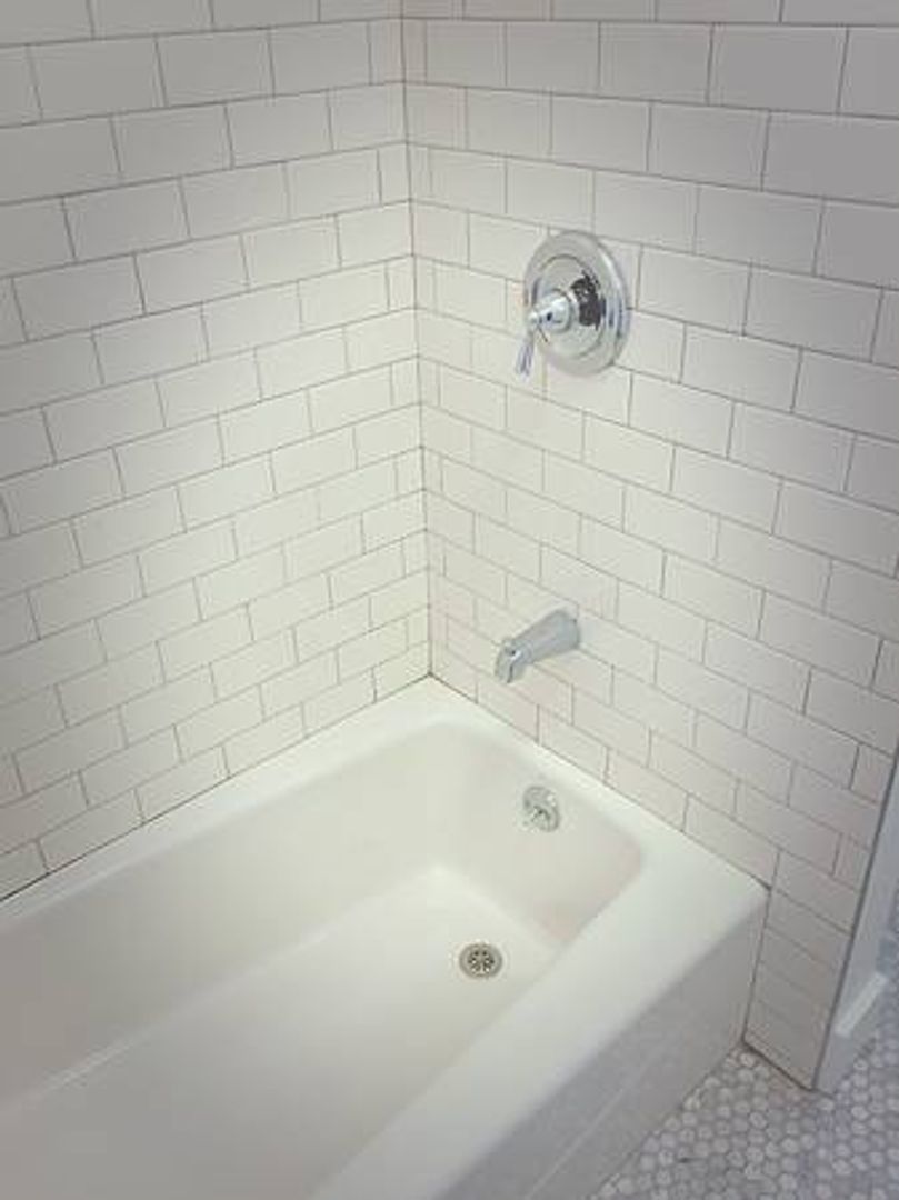 The oversized primary bedroom features a walk-in closet and window A/C. The second bedroom works well as a den or office, complete with its own mini split and partial views of downtown LA. The bathroom features penny-tile flooring, a dual vanity, and a subway-tiled tub for a clean, timeless feel.