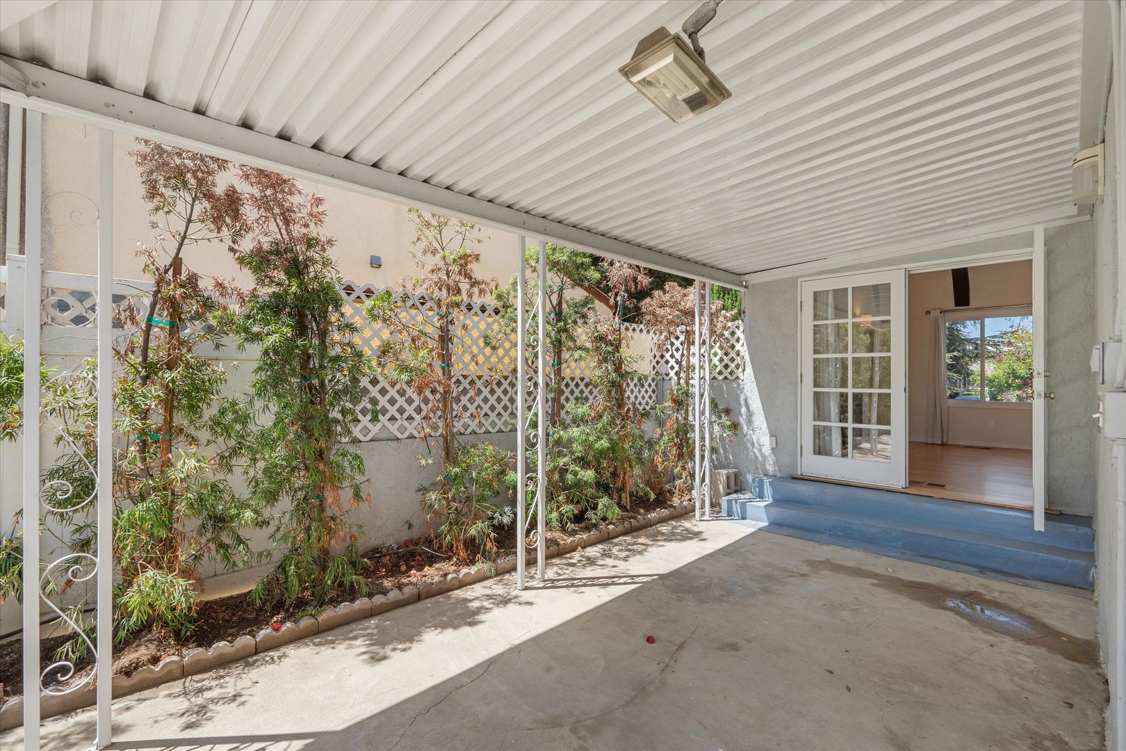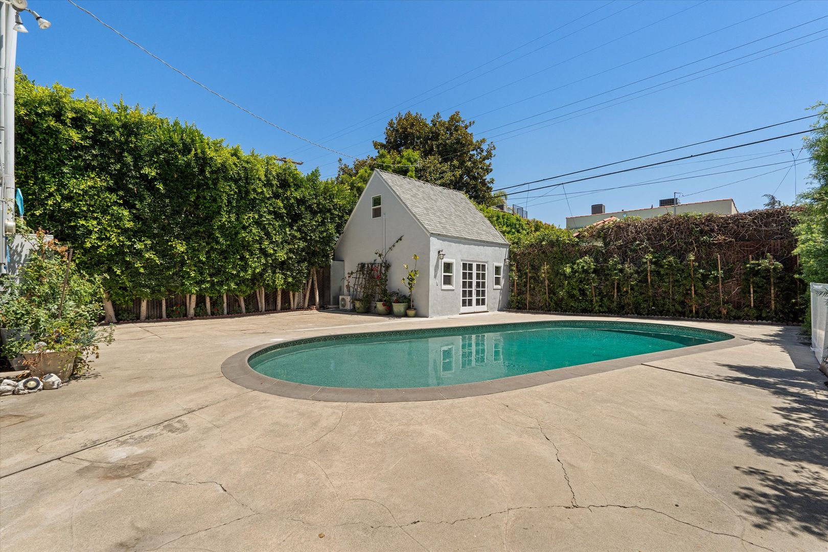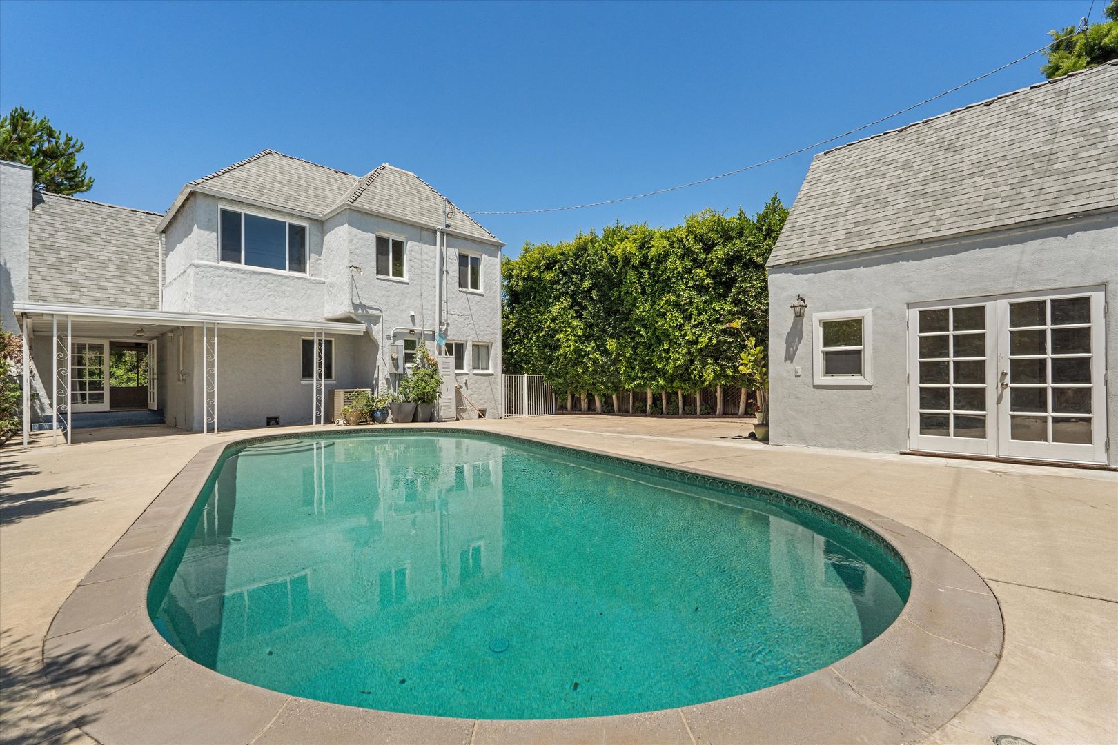 French doors lead from the living room to a private backyard with a covered patio, PebbleTec pool, and tall privacy hedges.