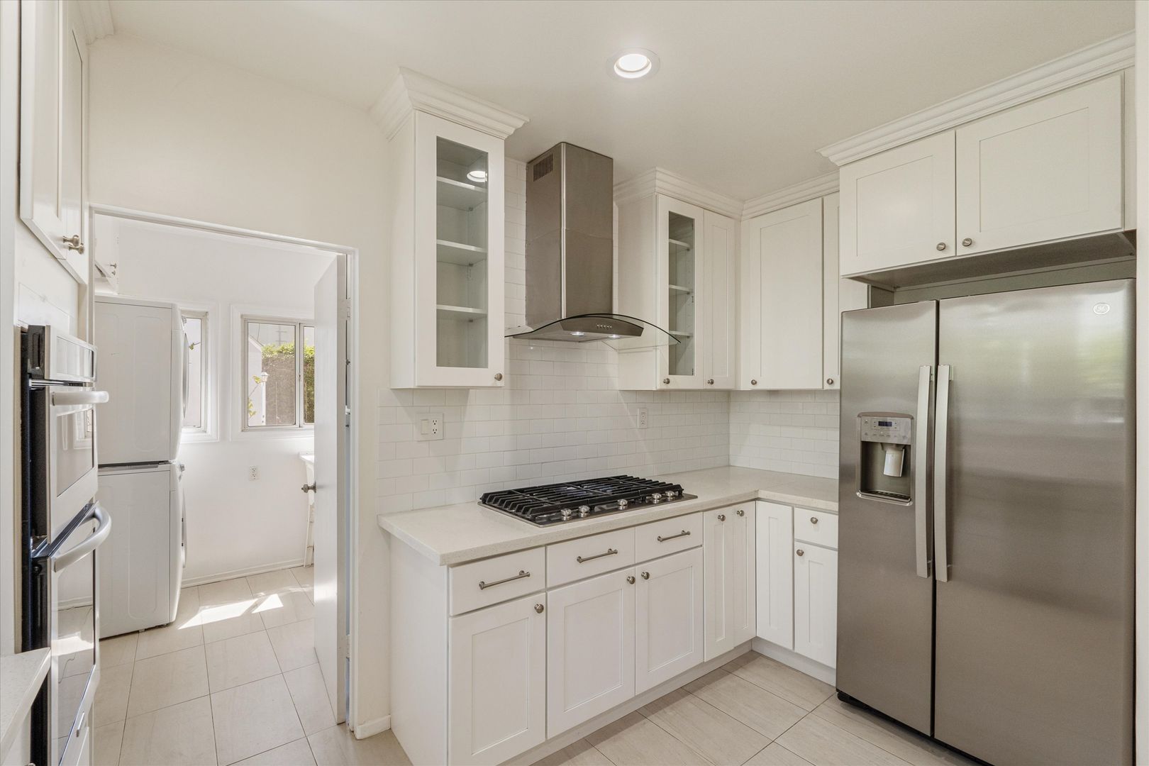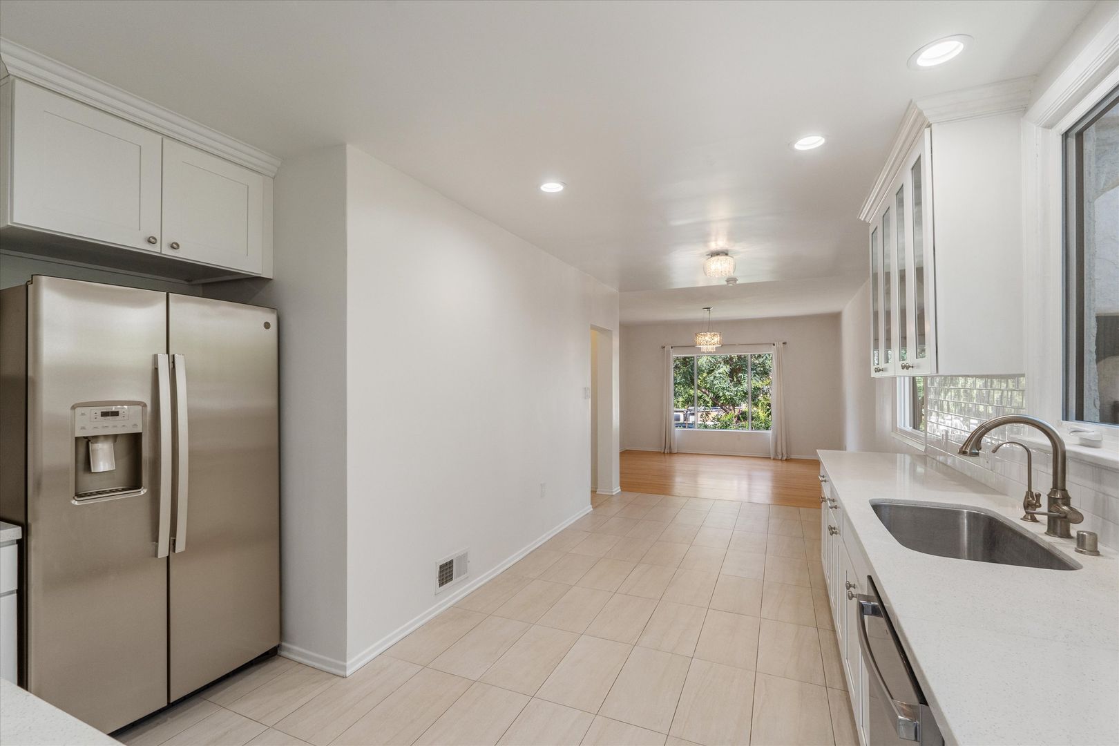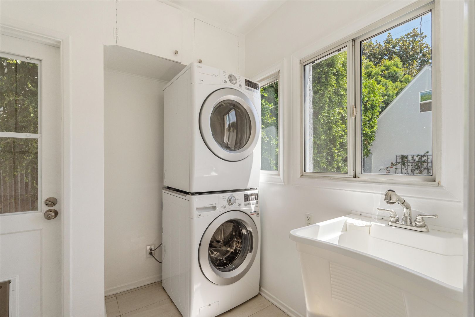 The property layout is a 3 bed, 2 bath in the main house + studio with full bath in the detached guest house. The main house features original hardwood floors, vaulted ceilings in the living room, an electric fireplace in the living room and an Ecobee smart thermostat. The spacious living area flows into a formal dining room and a large updated kitchen with stainless steel appliances, subway tile backsplash, shaker cabinets, and new countertops. A separate laundry room includes a stackable washer and dryer.
