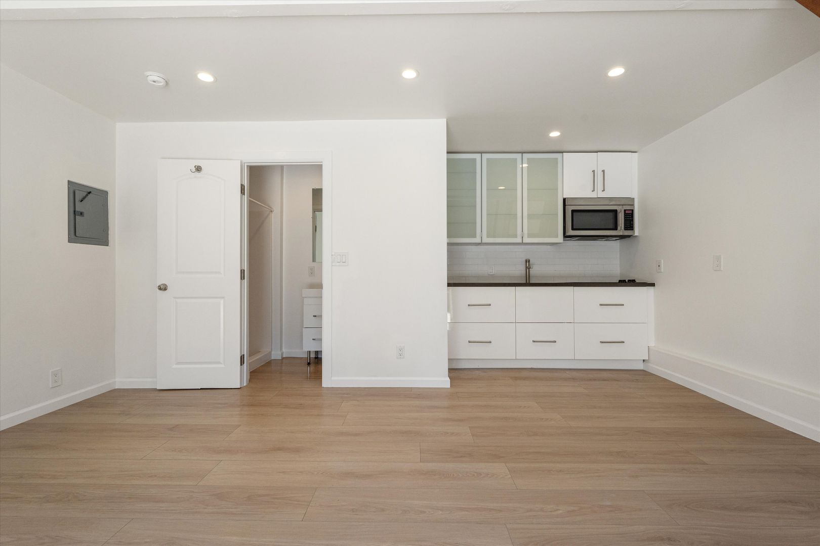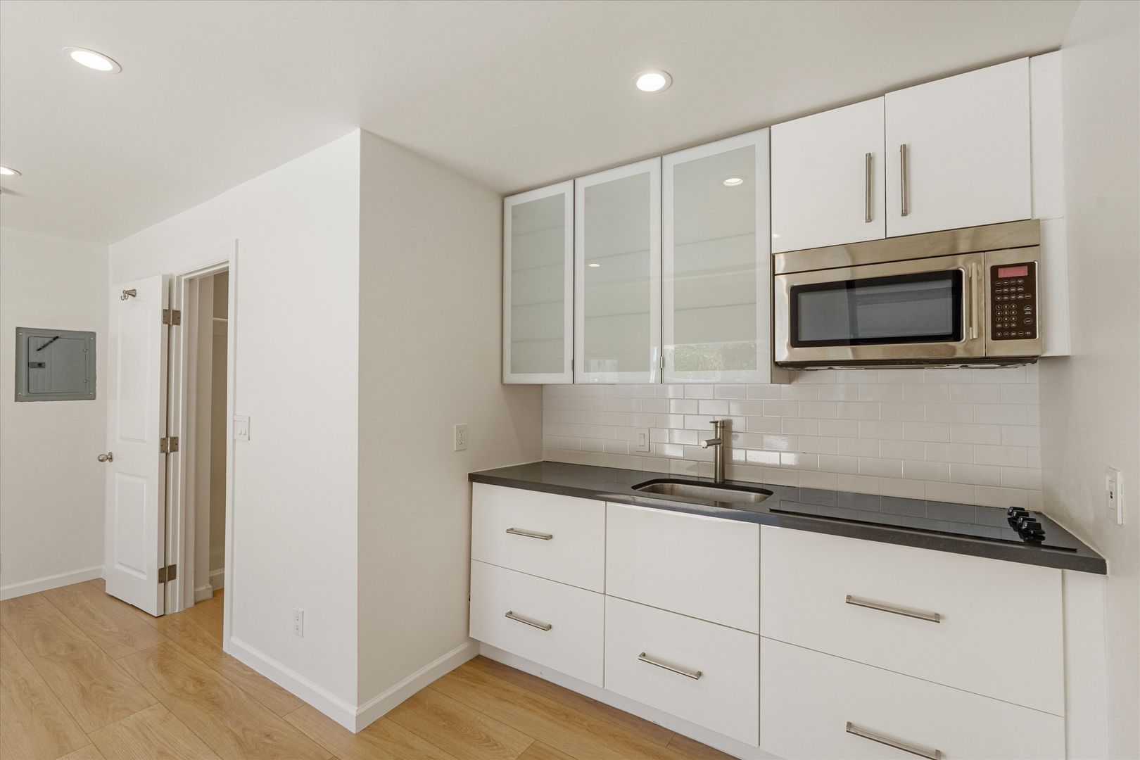 The detached ADU adds approximately 400 square feet of bonus living space with vaulted ceilings, recessed lighting. It includes its own kitchen with an electric stovetop, microwave, and mini-fridge, as well as a full bathroom and washer/dryer hookups.