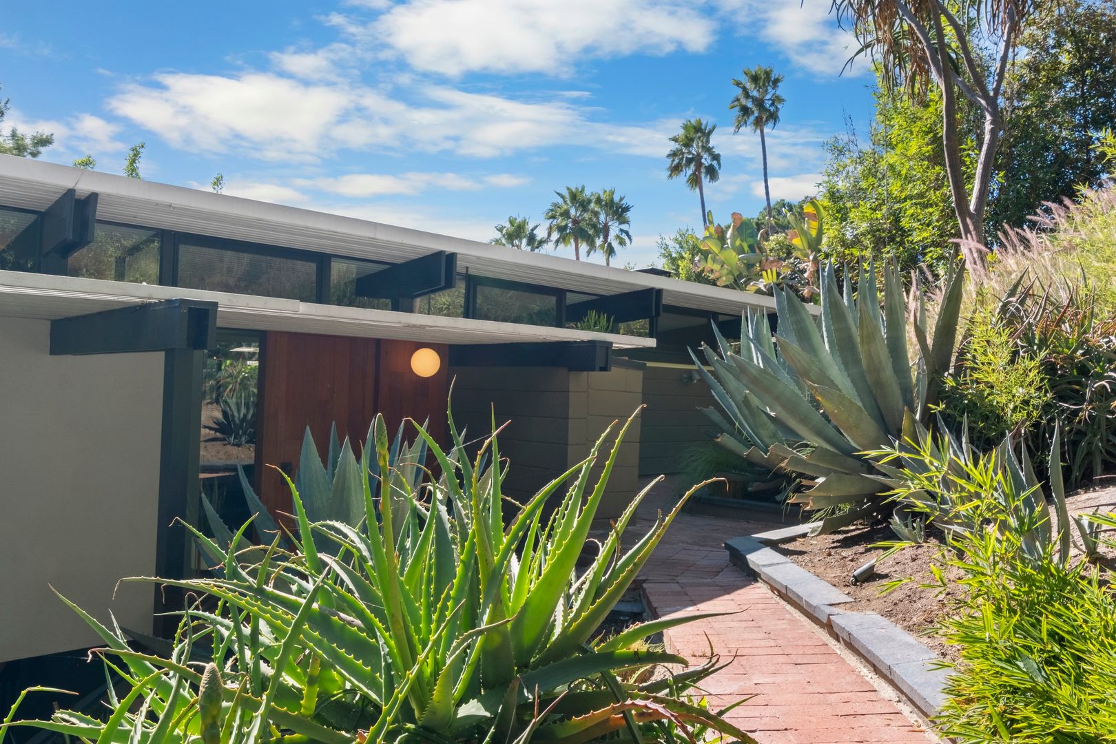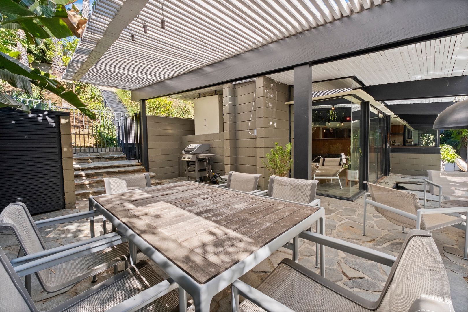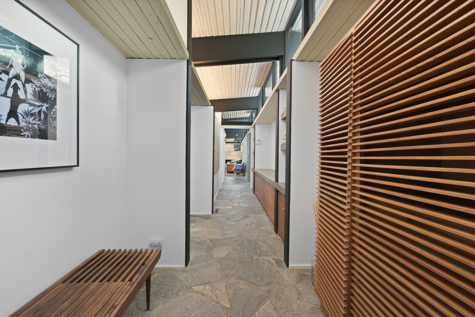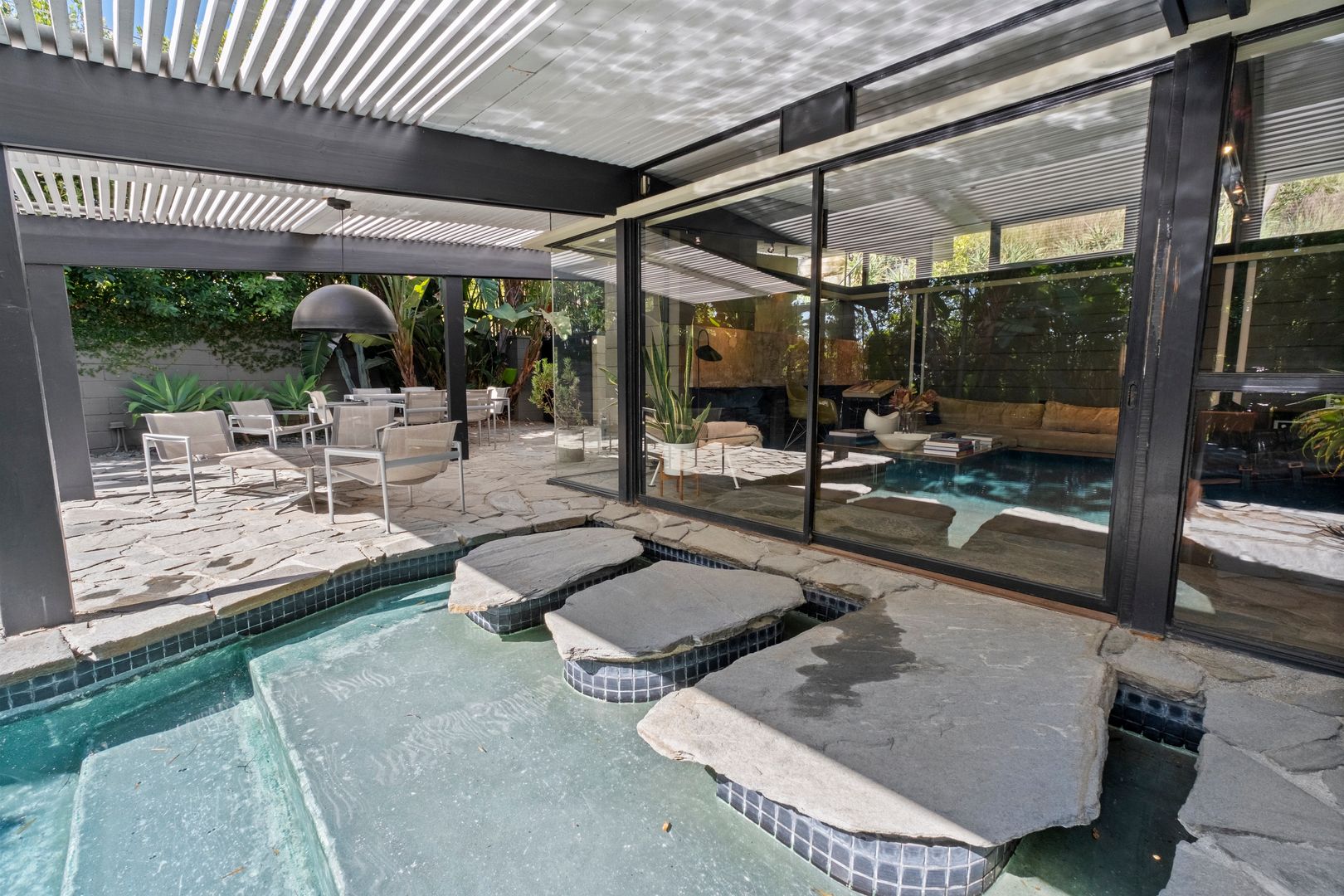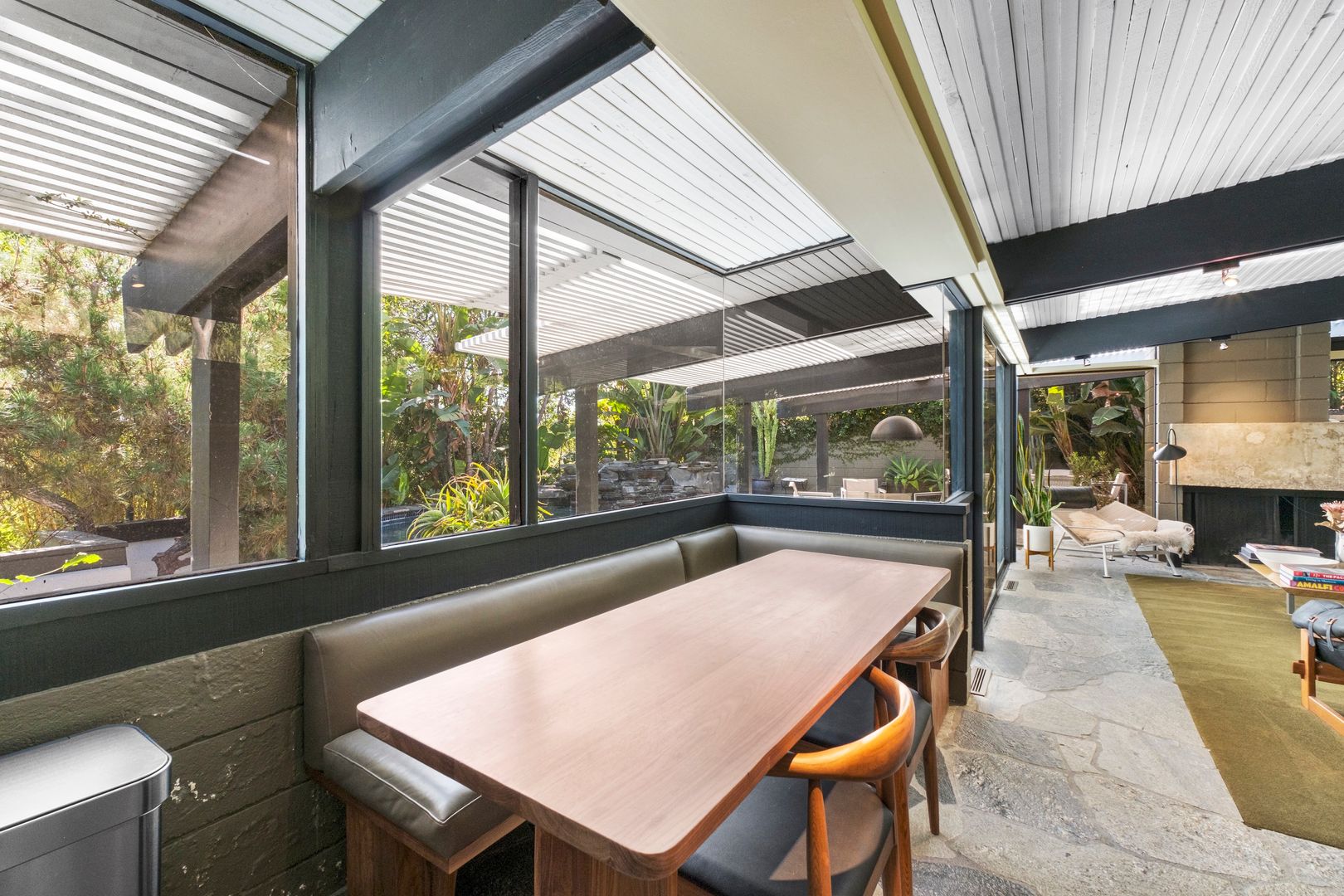 Designed by Dutch architect John Sjoberg and captured by Julius Shulman for Modernism Rediscovered, this mid-century modern home features Brutalist accents and mature native landscaping for privacy. The post-and-beam construction offers an open floor plan with glass walls, creating seamless indoor/outdoor living. Highlights include a cement fireplace, upgraded kitchen with soapstone counters, Carrara marble, and custom stone and recycled glass tile work throughout. The main house features a primary suite with spa-like bath, a guest bedroom, and a modernized bathroom.