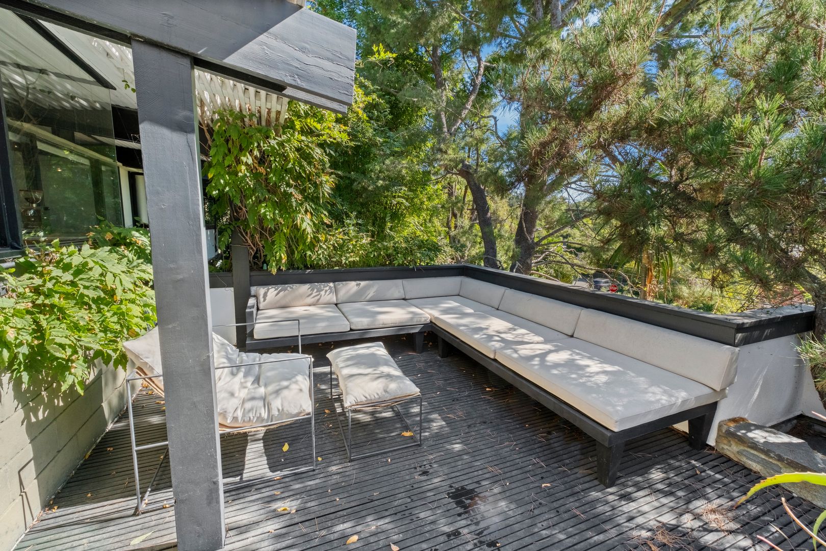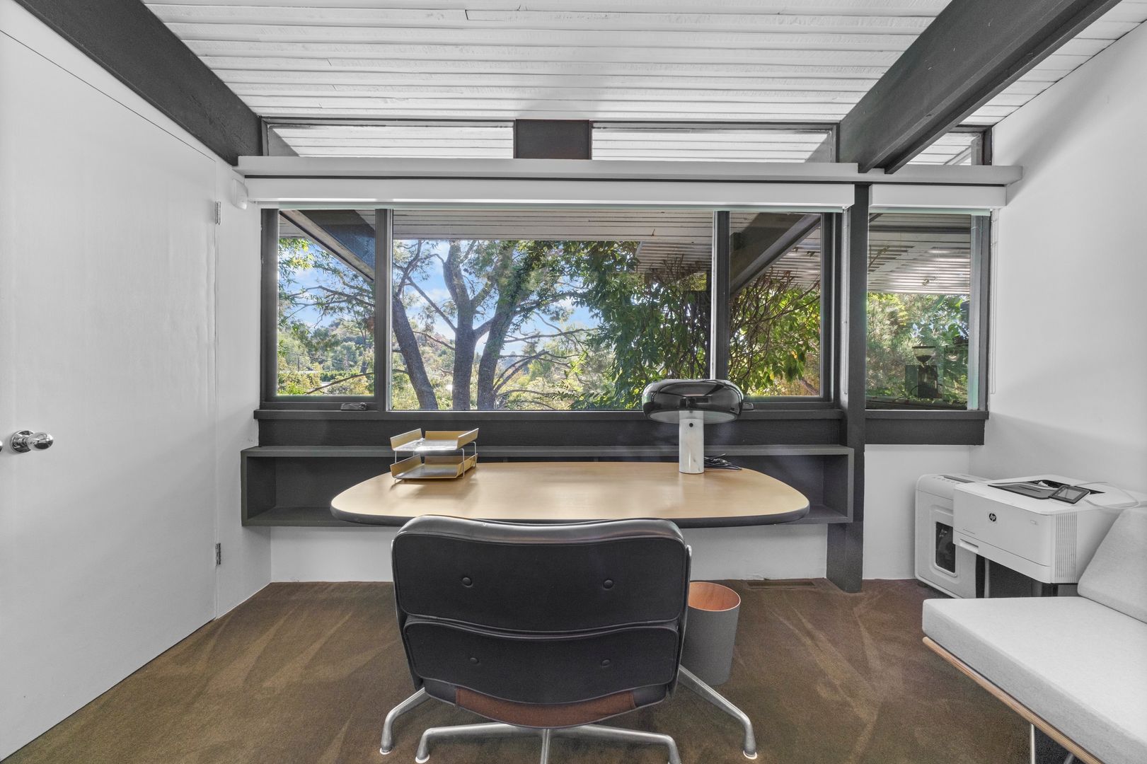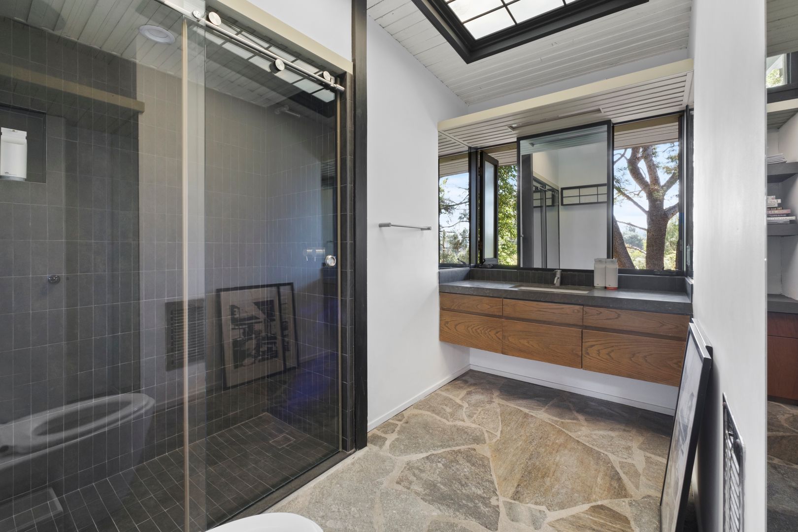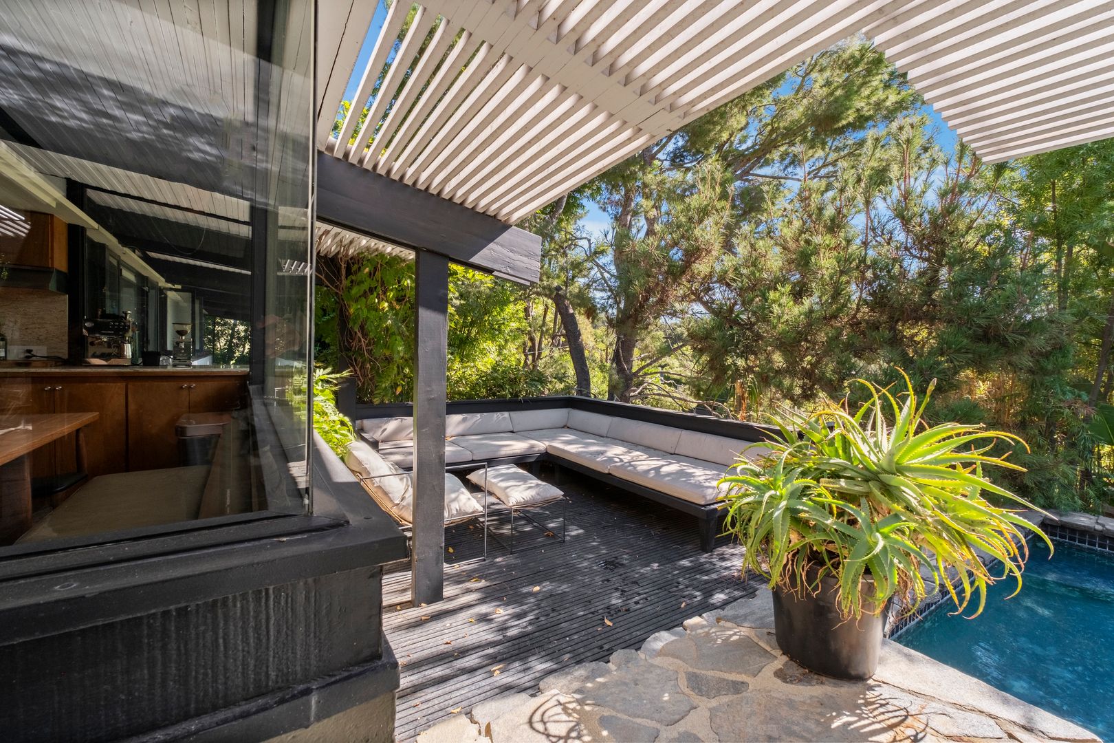 Designed by Dutch architect John Sjoberg and captured by Julius Shulman for Modernism Rediscovered, this mid-century modern home features Brutalist accents and mature native landscaping for privacy. The post-and-beam construction offers an open floor plan with glass walls, creating seamless indoor/outdoor living. Highlights include a cement fireplace, upgraded kitchen with soapstone counters, Carrara marble, and custom stone and recycled glass tile work throughout. The main house features a primary suite with spa-like bath, a guest bedroom, and a modernized bathroom.