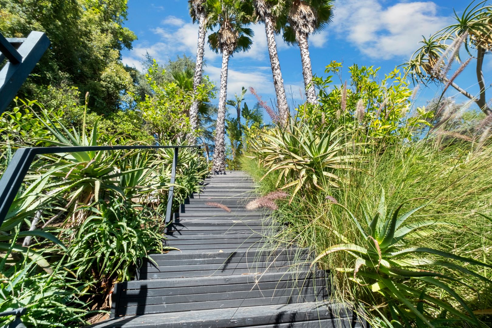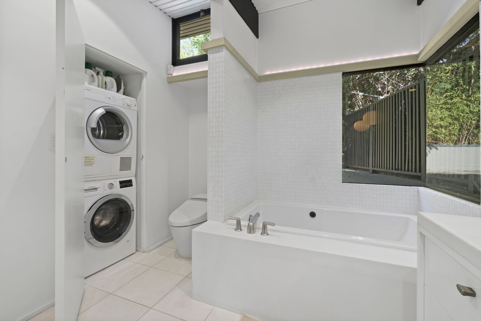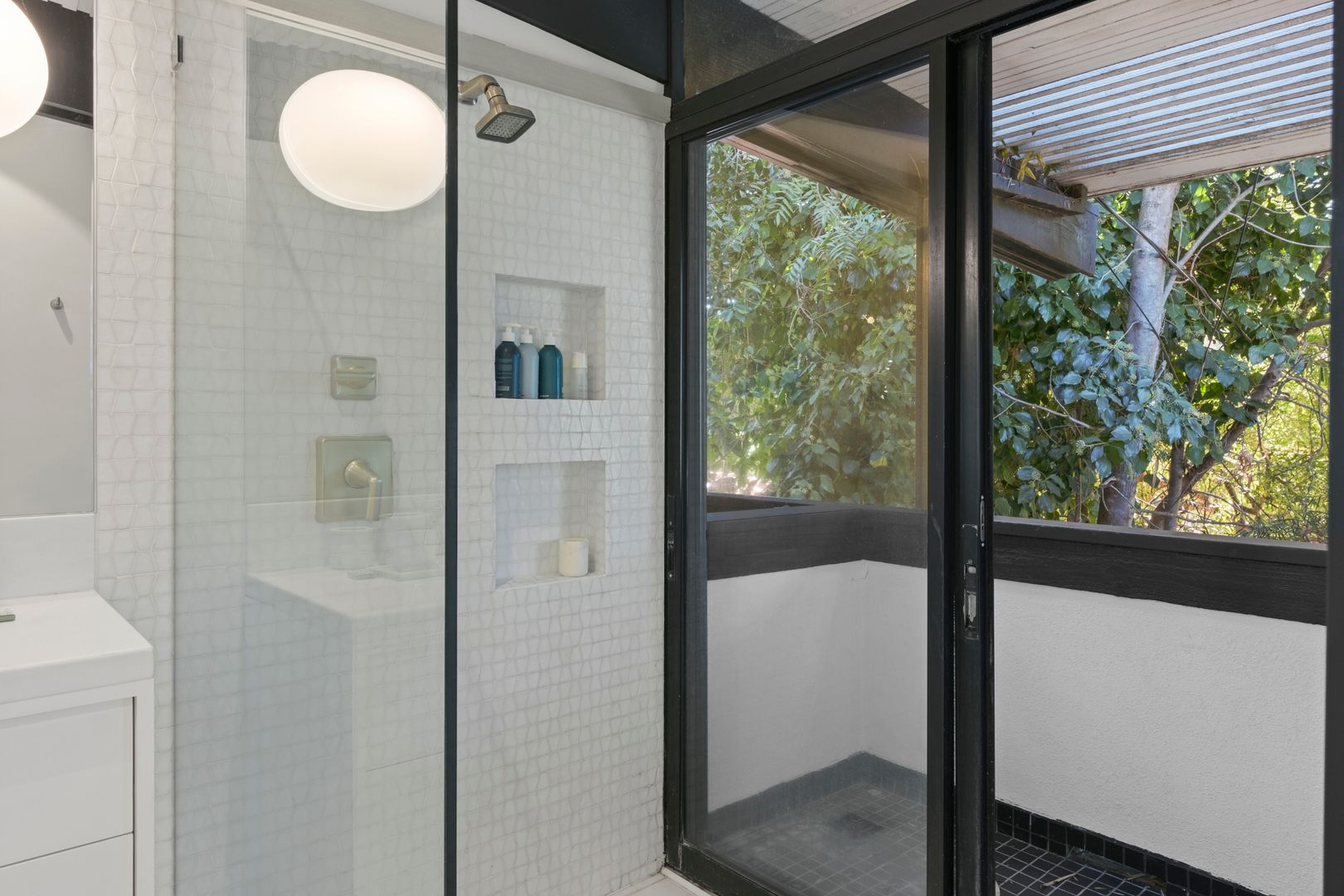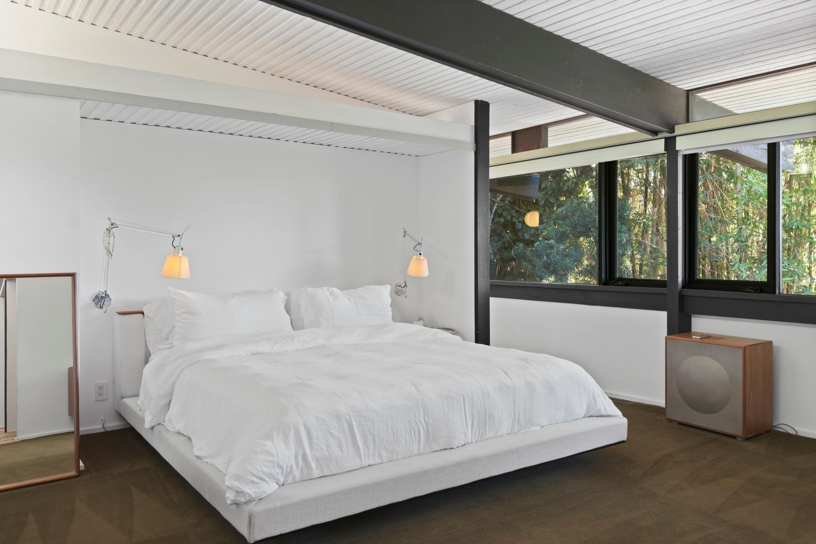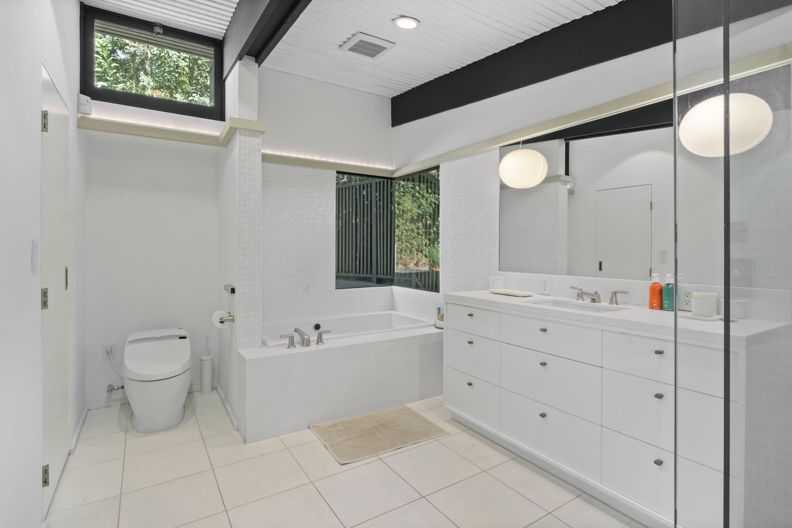 Designed by Dutch architect John Sjoberg and captured by Julius Shulman for Modernism Rediscovered, this mid-century modern home features Brutalist accents and mature native landscaping for privacy. The post-and-beam construction offers an open floor plan with glass walls, creating seamless indoor/outdoor living. Highlights include a cement fireplace, upgraded kitchen with soapstone counters, Carrara marble, and custom stone and recycled glass tile work throughout. The main house features a primary suite with spa-like bath, a guest bedroom, and a modernized bathroom.