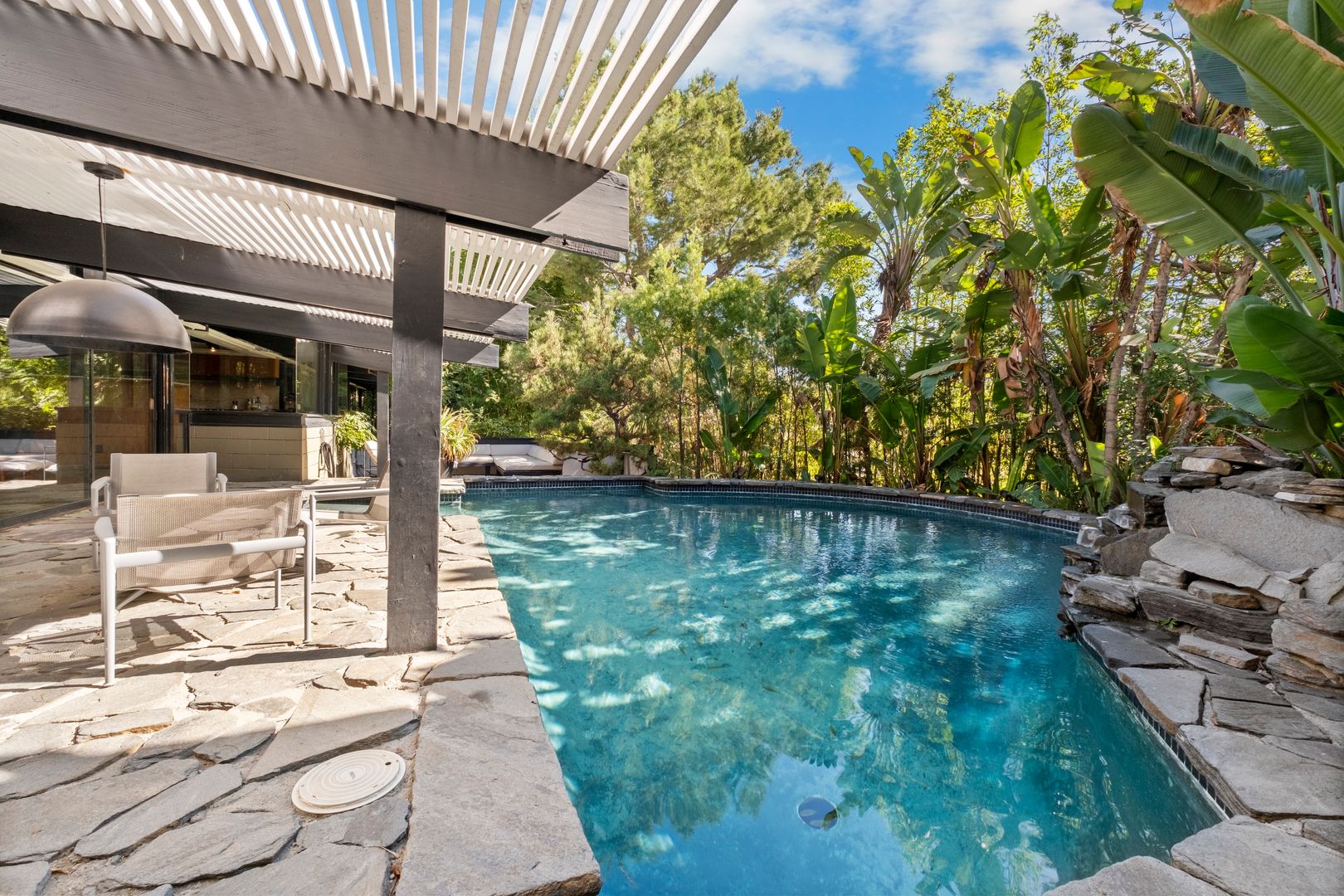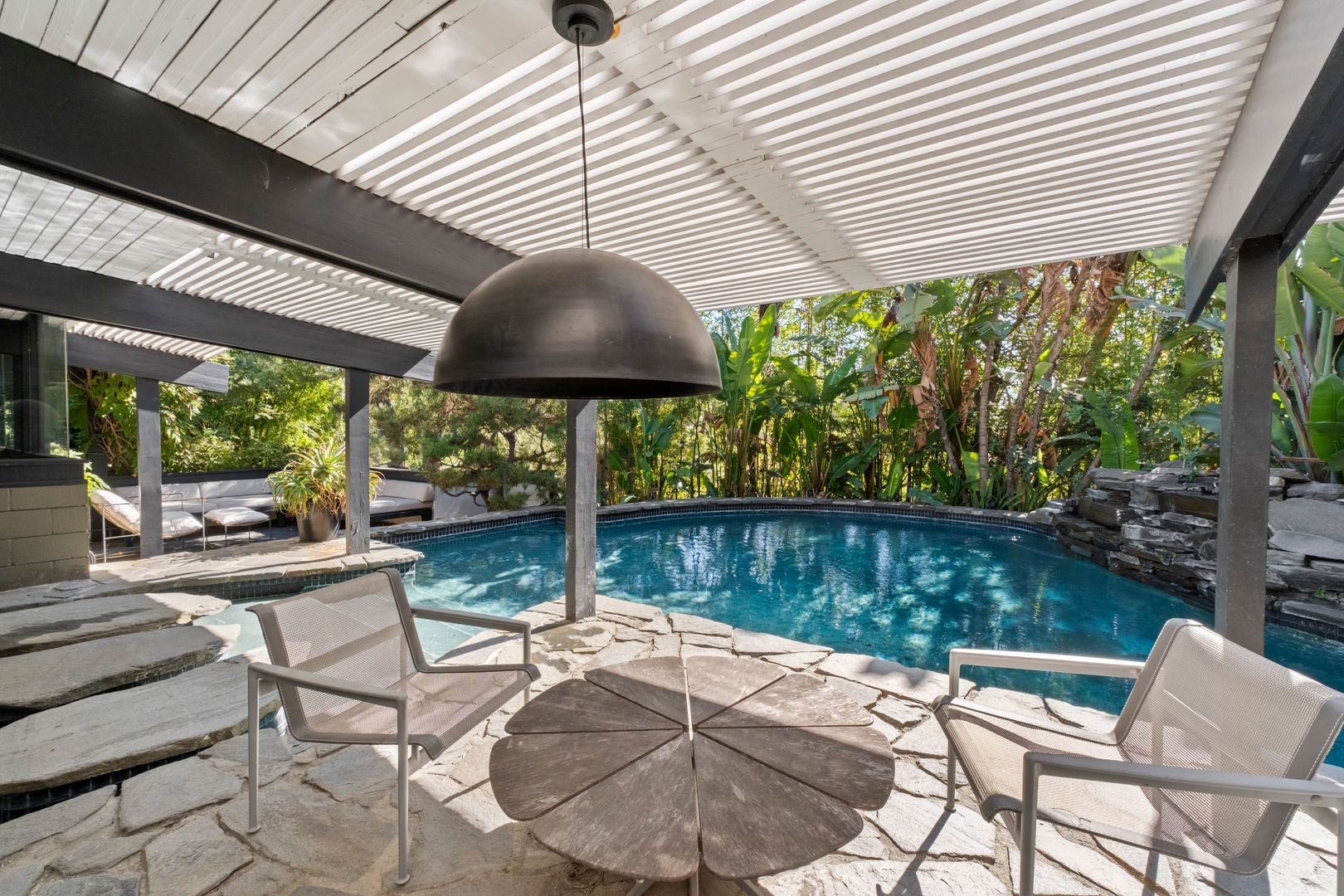 A separate studio residence with a 3/4 bath, private entrance, koi pond, and waterfall offers flexible use for work or leisure. Outdoor spaces include a lagoon-style pool, meditation pavilion, and multiple dining areas with views of Laurel Canyon.