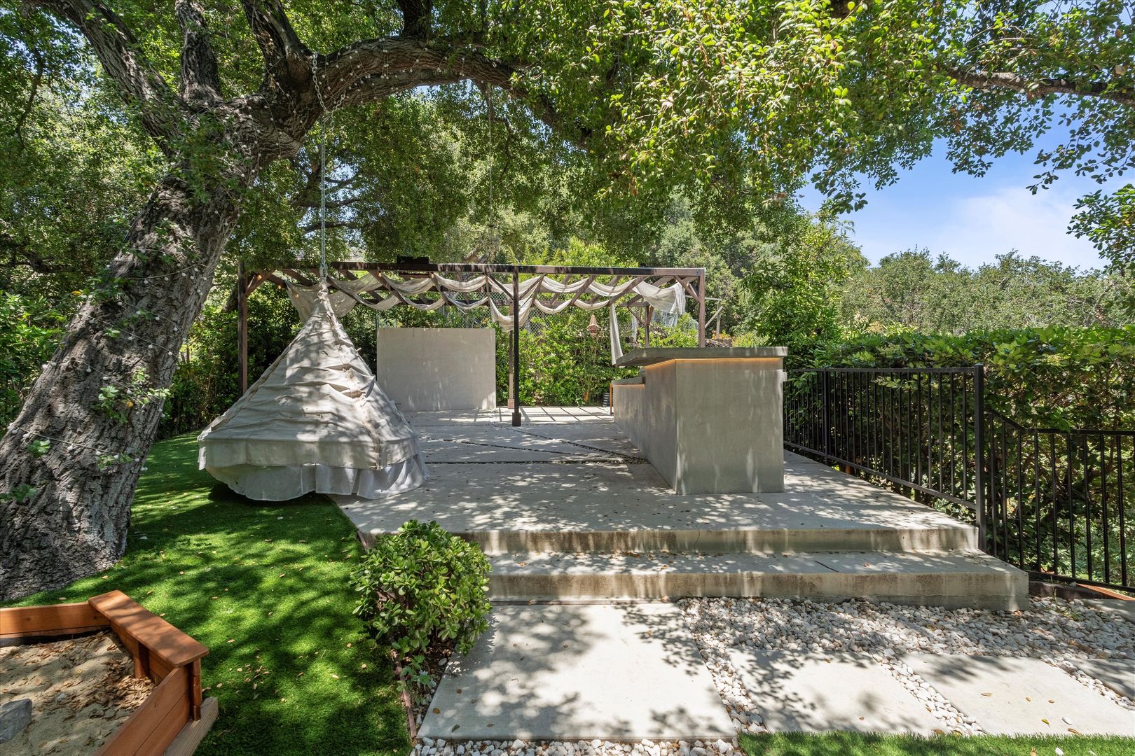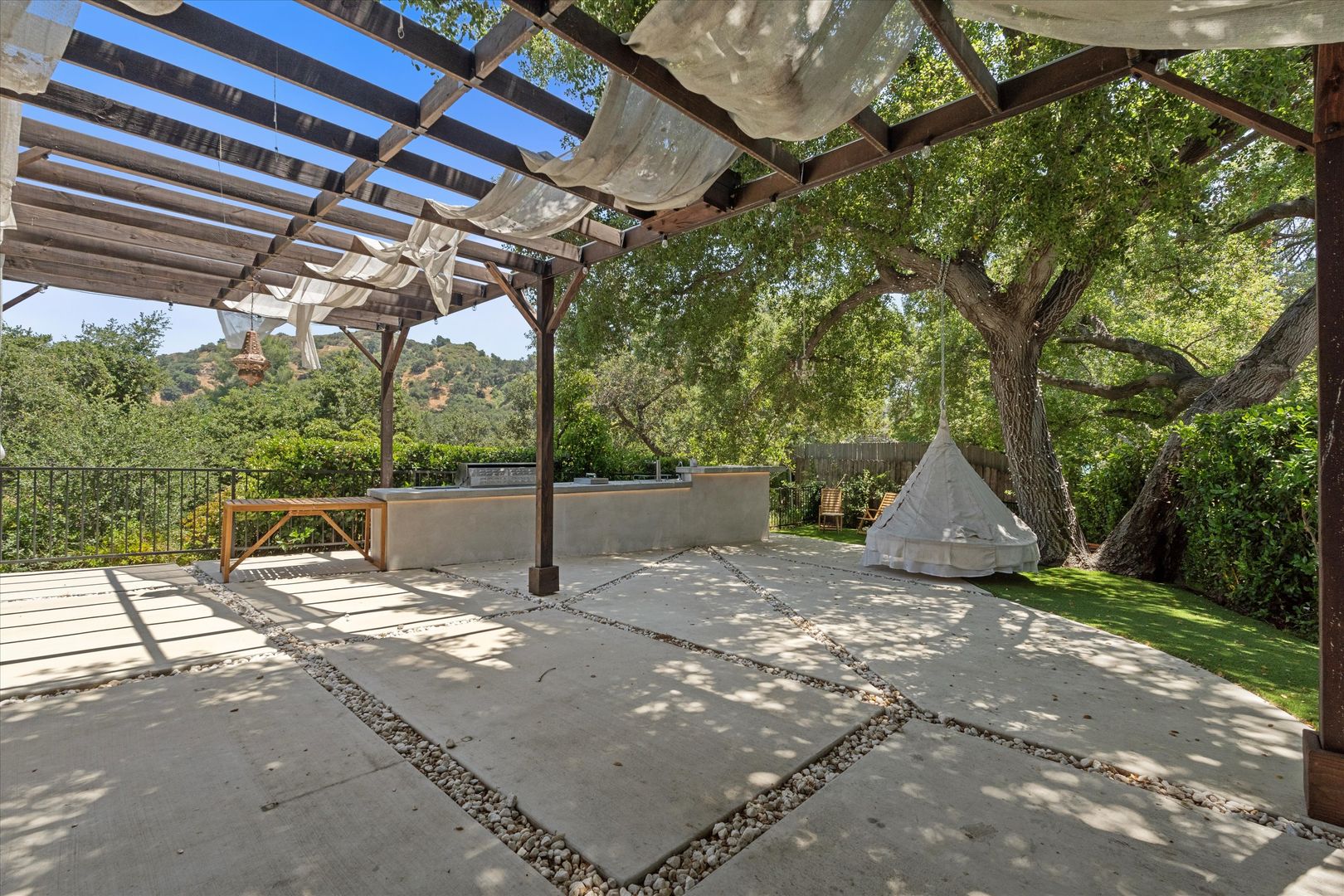 Step through the sliding glass doors from the dining room to the back patio, where you can enjoy the sparkling swimming pool on warm summer days. An expansive entertainment space offers stunning views of the surrounding hills, complete with a built-in barbecue island that includes a stainless steel grill, sink, and keg dispenser. This area is ideal for dinner parties, shaded by a magnificent California Live Oak.